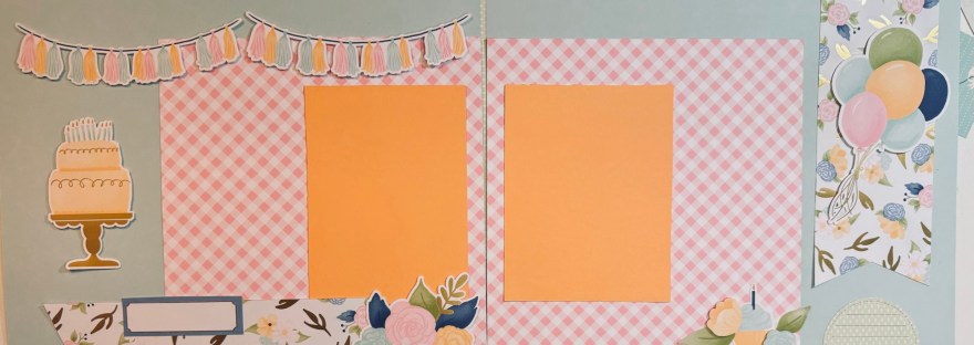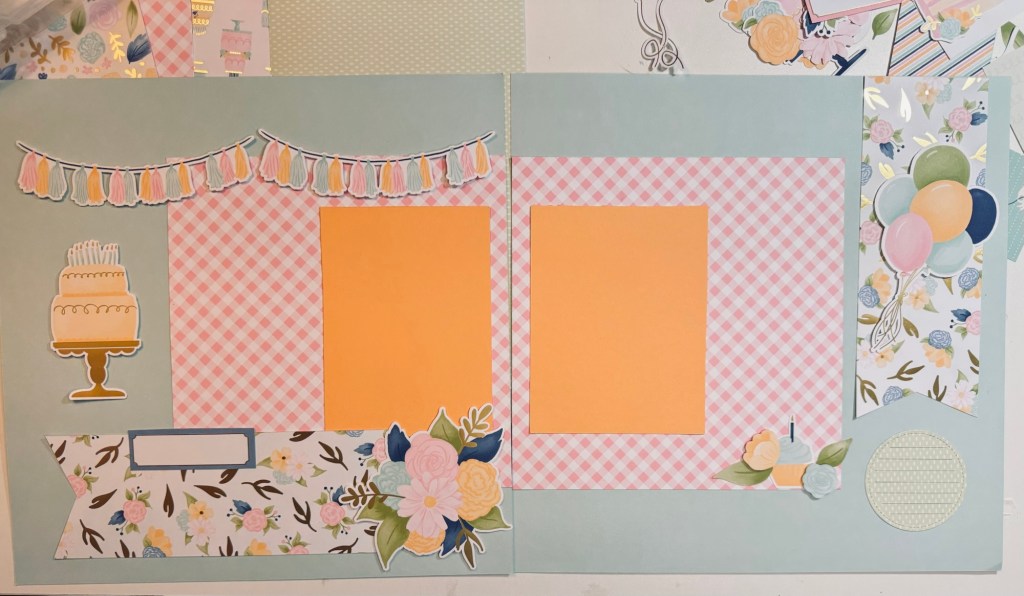 I used two 12” x 12” pool party cardstock papers for the bases. Then, I cut 2 pieces of the pink gingham paper to 8” x 8”. The two wildflower banners were 8” x 3”. For the photo mats, I cut two pieces of peach pie card stock at 4” x 6”.  Then, I embellished using pieces from the wildflower specialty designer paper. I will add a Title later and most likely add four small pictures to the right and to the left of the peach pie cardstock pieces. The space should fit two pictures on each side sized at 3” x 2”. Or even 3” x 2 1/4” each.